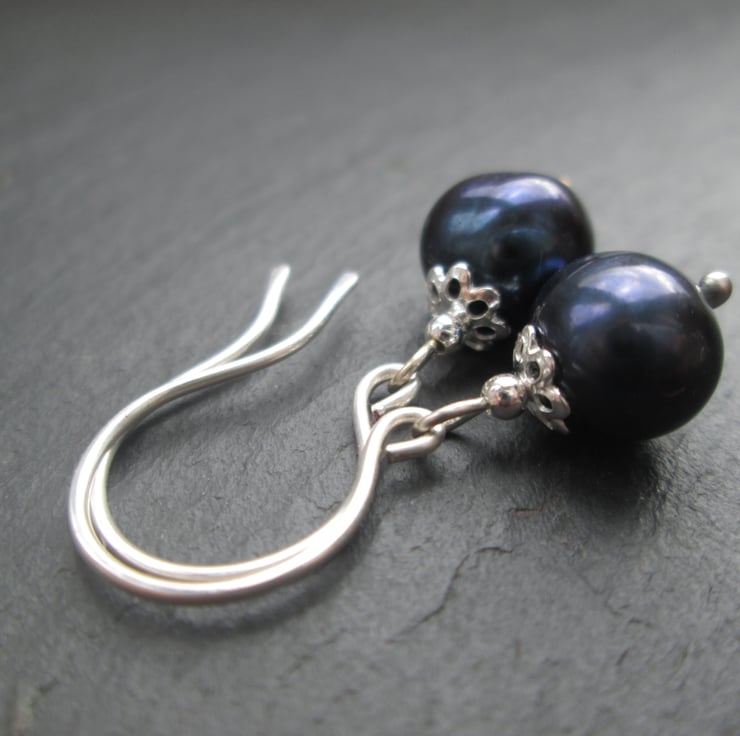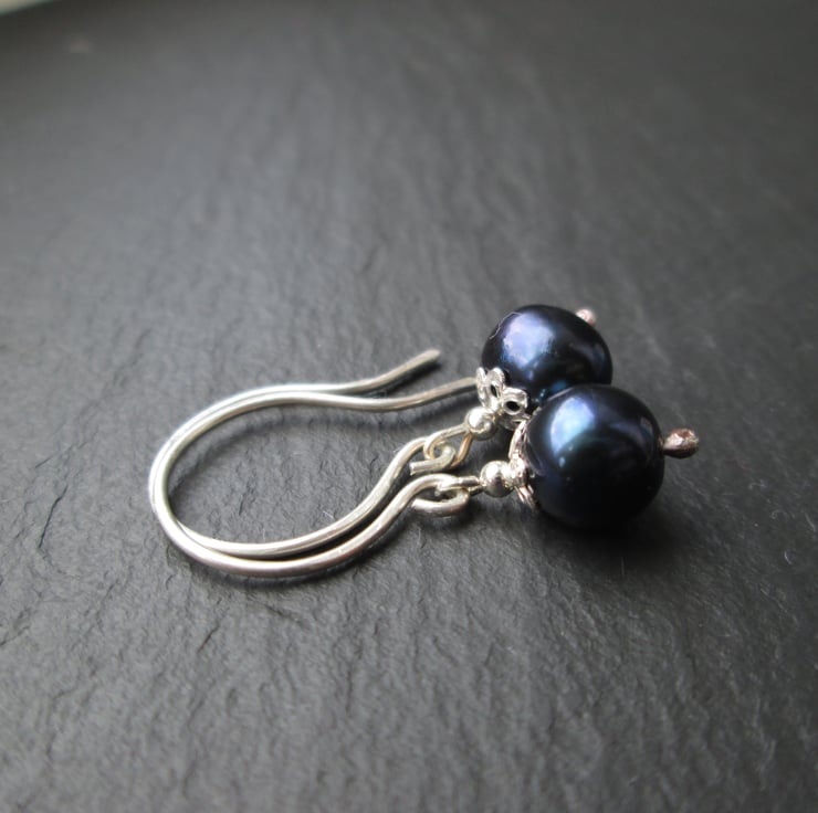 Two peacock pearls hang delicately handcrafted sterling silver ear hooks to create these classic pearl drop earrings. The pearls (8mm) have a stunning petrol sheen with blue and black hues and hints of purple and green in some lights.