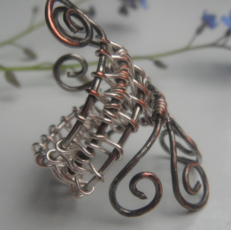 The front of the ring has then been treated with Liver of Sulphur, to tarnish it, and then been hard polished to remove some of the silver plate, to reveal the copper beneath. The end result is a multi-tone, distressed/aged effect.