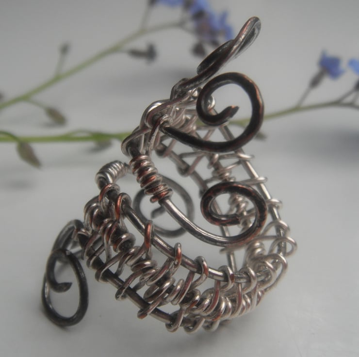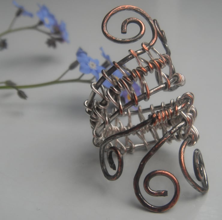 Triple strands of fine silver plated wire have been wrapped n 0.6mm wire, to form a fancy band of around 1cm wide. The ends have then been twisted into fancy loops, and lightly hammered to give texture, and strengthen.