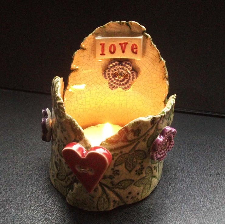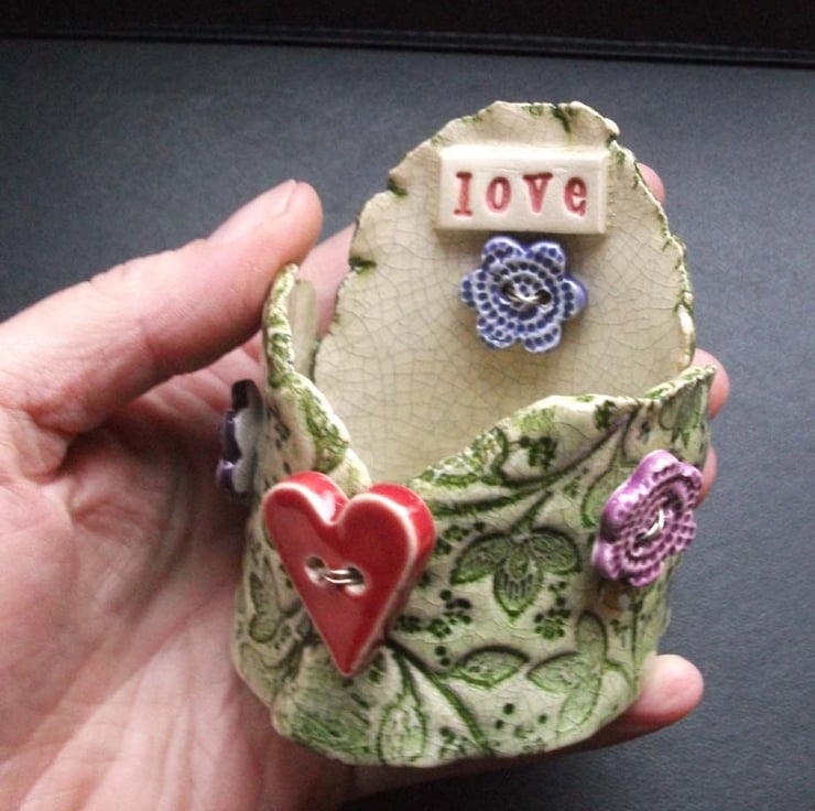 This cute little tea light holder or trinket pot is made from white earthenware clay.