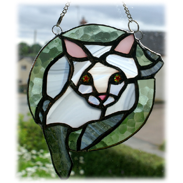 The background is made of a lovely prettily textured clear pale green glass which sets off the colour of the cat beautifully.