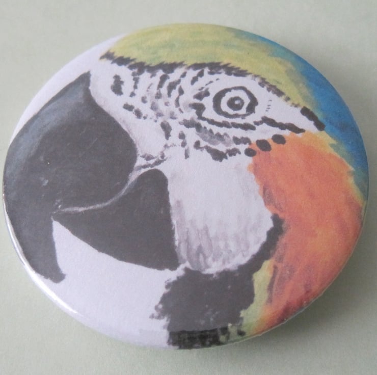 A badge made from a print of one of my original art works, featuring a brightly coloured parrot.