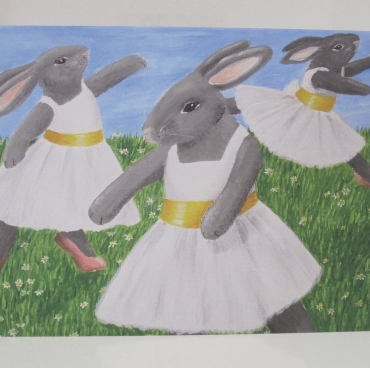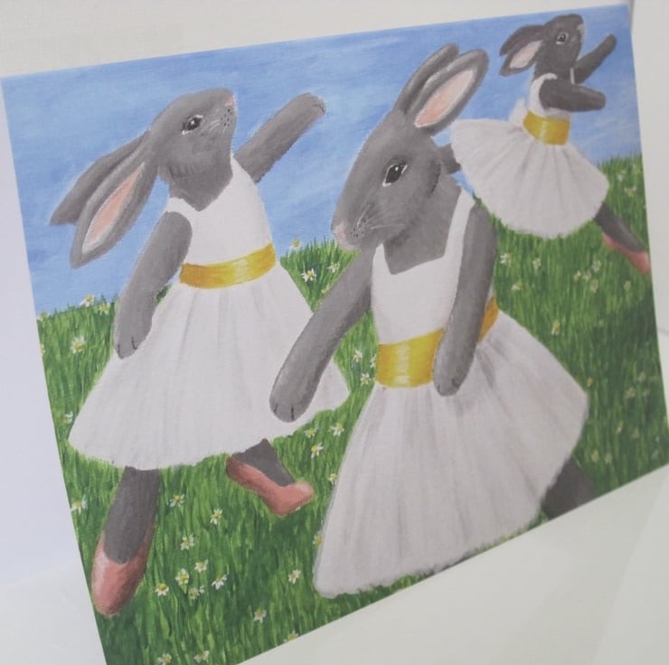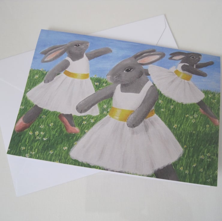 This is a blank greetings card, professionally printed, using a print of one of my original acrylic paintings of dancing bunny rabbits.