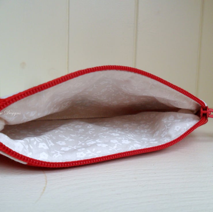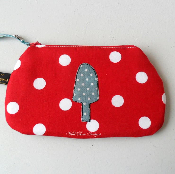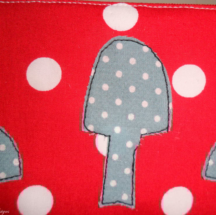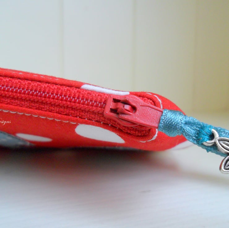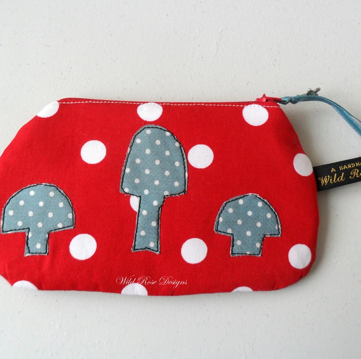 A really cute purse made in a red cotton with large white spots. It has appliqued mushrooms in a teal cotton with small cream spots. There are three mushrooms on the front and one on the back.There is a teal coloured, ribbon zip pull which has a flower charm attached and it is lined with a cream cotton print fabric.