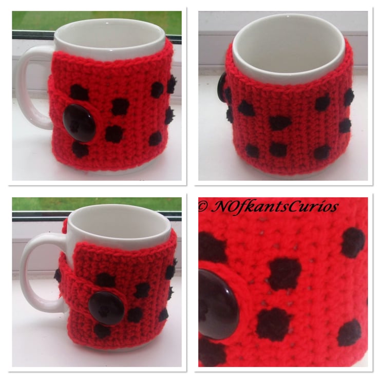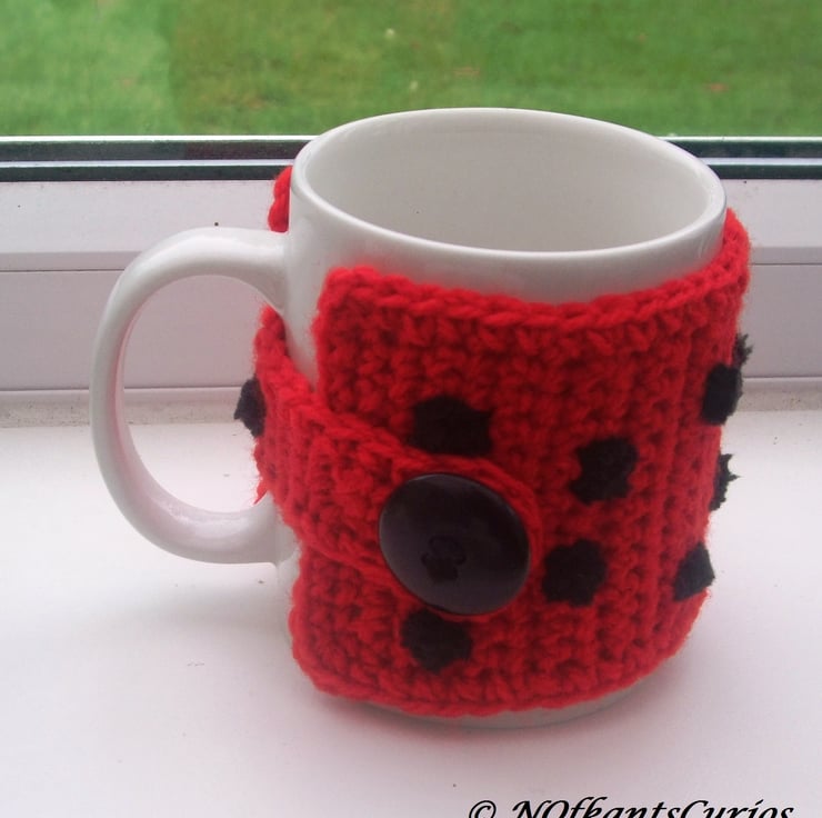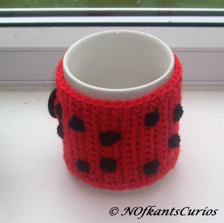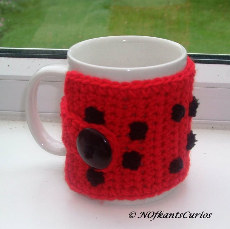 Ladybird Mug Cosy, crocheted in a bright red acrylic yarn and embroidered with black chenille yarn raised spots, inspired by our wonderful ladybird and fastened with large black button.