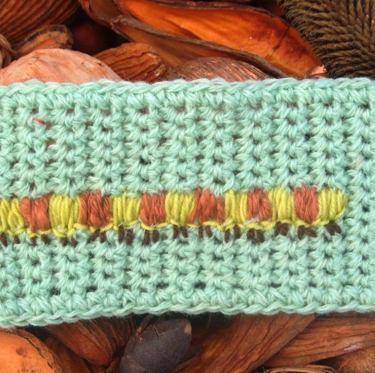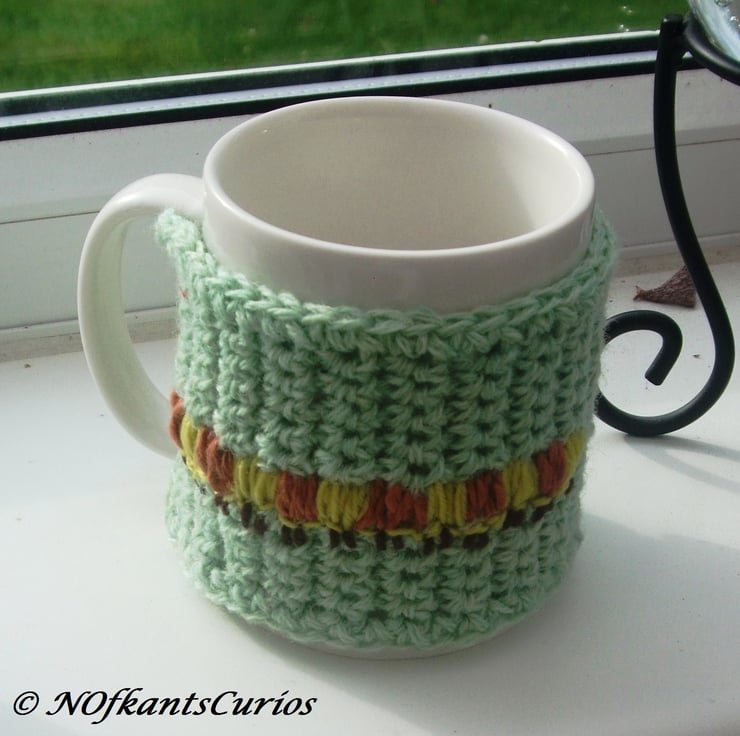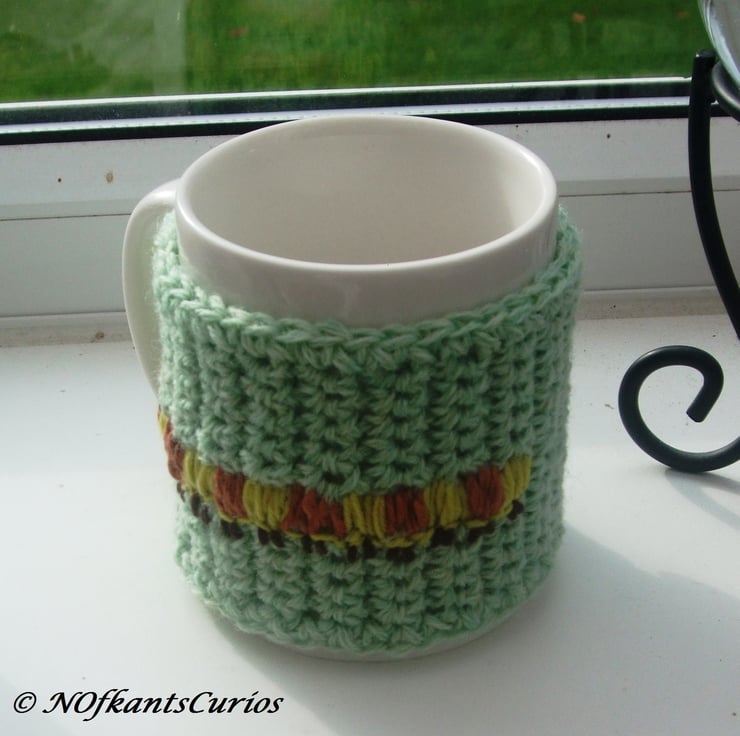 This Mug cosy is for average sized mug and crocheted in a continuous lines and then trimmed, or edged in the same yarn.