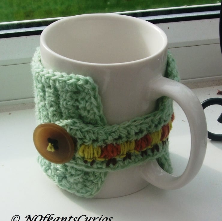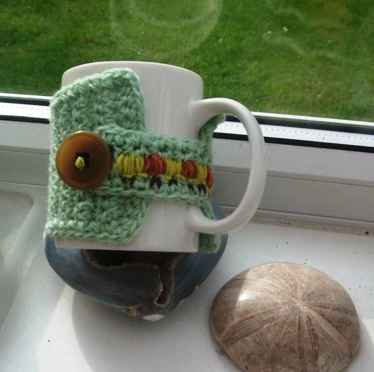 Caterpillar Mug Cosy, crocheted in a apple green woolen yarn and embroidered with a mustard yellow, russet and dark brown acrylic yarn striped caterpillar walking along the centre of the mug cosy and fastened with large beige button which also forms the head of the caterpillar.