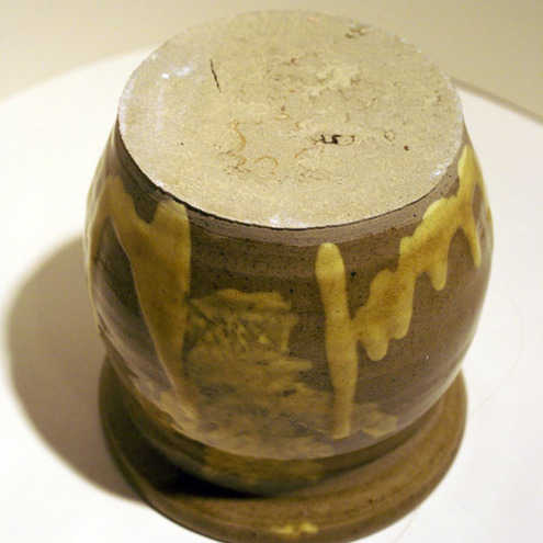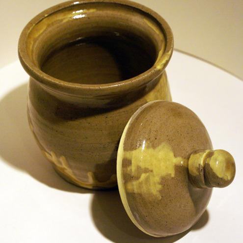 The jar is glazed in transparent giving a soft honey beige colour. Sunny yellow splashes of slip decorate the body and lid of the pot.