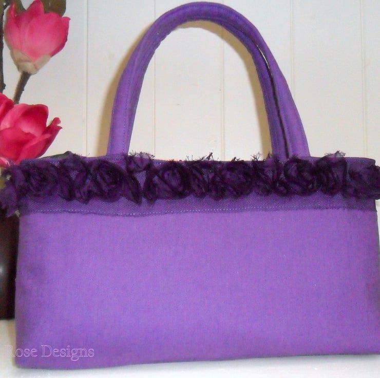 Stand out with this handmade handbag in a purlple linen mix fabric. It is edged with a purple rosette trim and comes with a handmade brooch which can be positioned anywhere, even on yourself! It is lined in a yellow Pat Bravo cotton print and has 1 slip and 1 zipped pocket. The bag fastens with a magnetic snap.