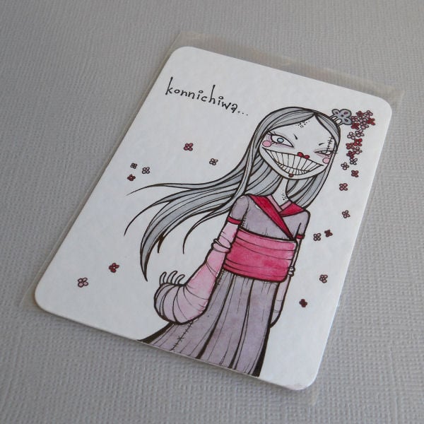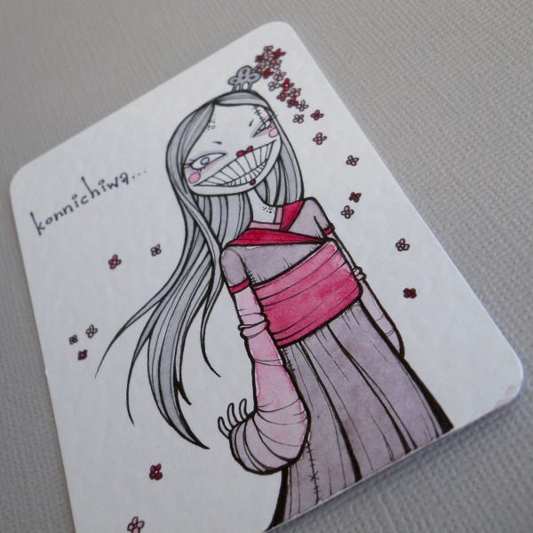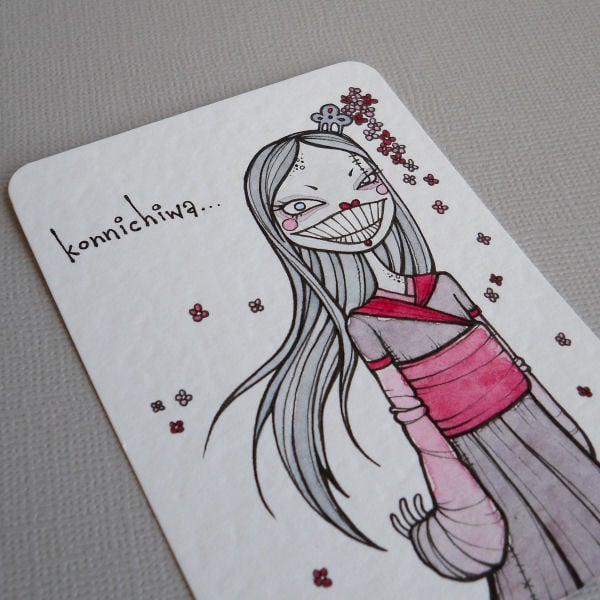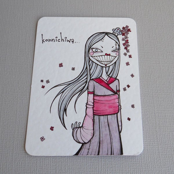 konnichiwa! this pretty zombie geisha has a rather cheeky look in her eye... you know the one: the "i'm coming over there to bite you in the face" kind of look.