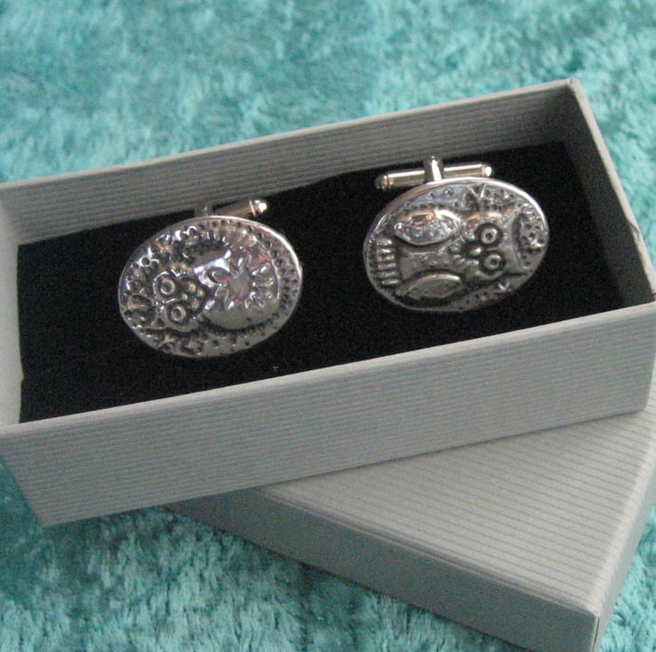 These cufflinks have been individually hand-made in pewter, and are ideal for a wedding or anniversary gift. Each one measures 26 x 20mm. Presented in a smart grey gift box.