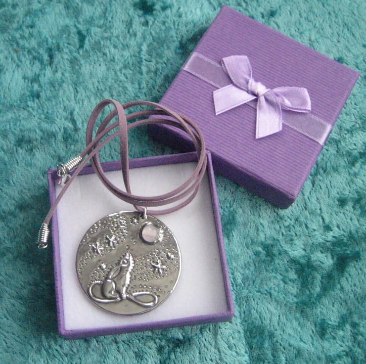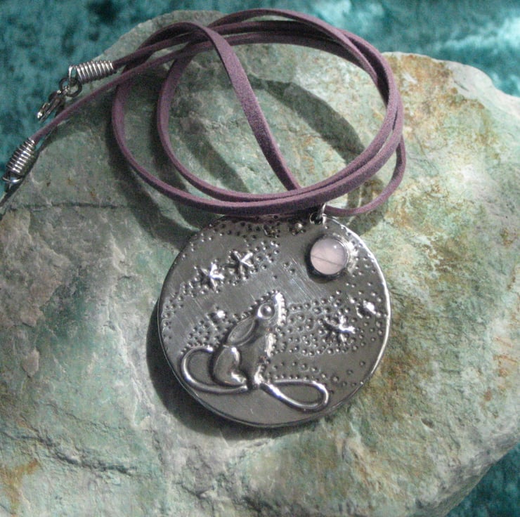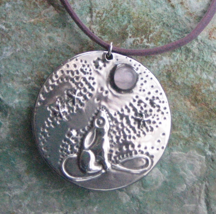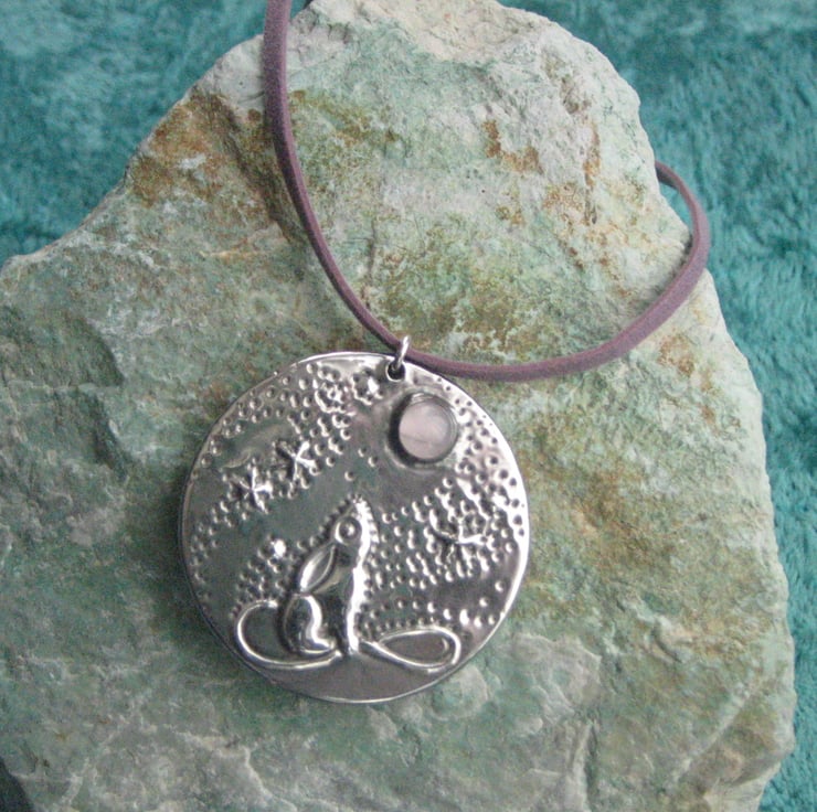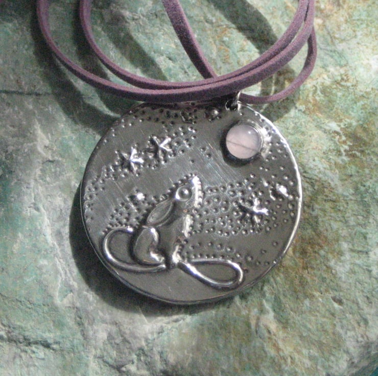 This lovely pendant features the legendary hare gazing up at a moon of genuine rose quartz. Measuring 38mm(1.5)across, it has been handmade in modern lead-free pewter, and comes on a simple suede effect lace (46mm long).