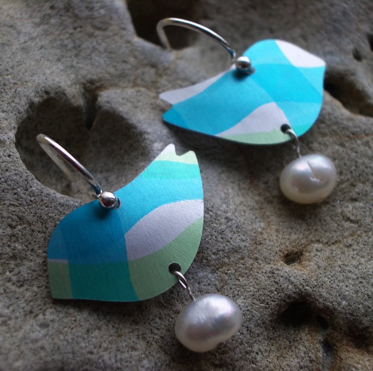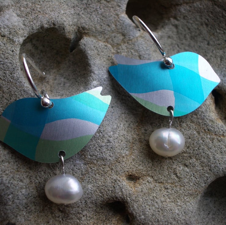 These sweet little bluey green bird earrings are made from aluminium which I have dyed in ribbons of colour and then sealed so that the dye becomes a permanent part of the metal. I then saw pierce the bird shapes by hand and dome them slightly so that they catch the light.