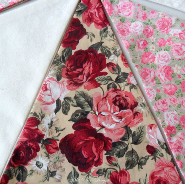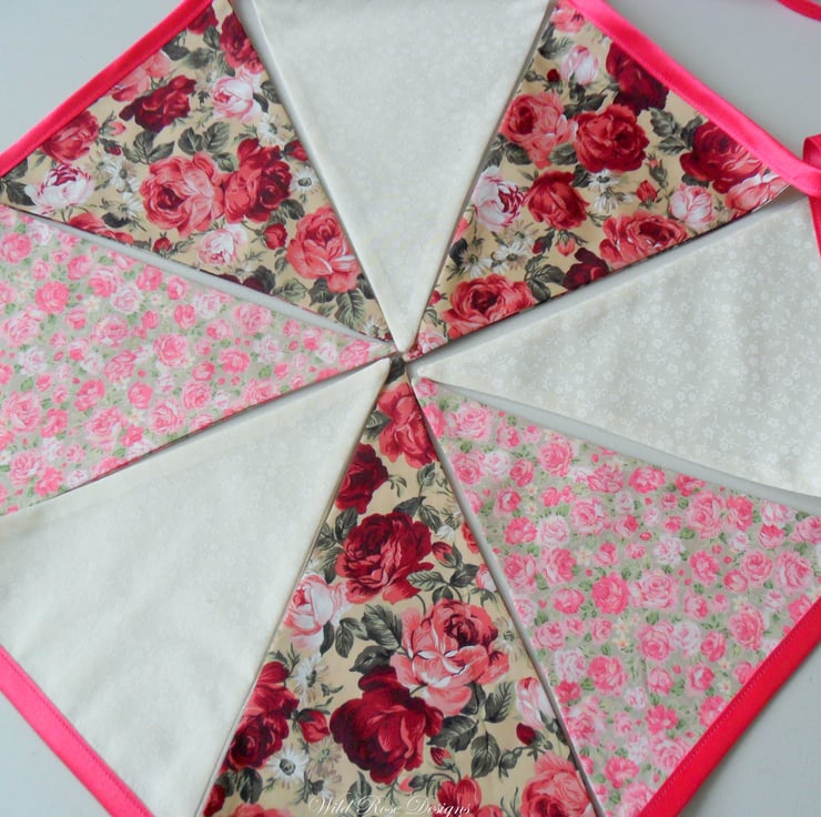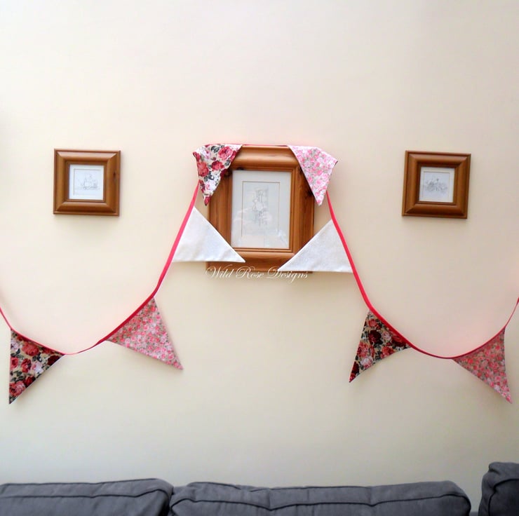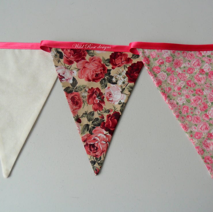 Very pretty bunting made in a mix of pink and cream cotton prints, this will definitely give your home a country feel. The flags are double faced and are attached to a deep pink satin bias binding. Each flag measures approximately 15cm wide and 19cm long and they are spaced 10cm apart. There are ten flags and 30cm of ribbon (excluding hanging loops) at each end, making the whole thing a tad over 3 metres long.
