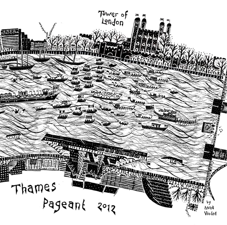 A3 limited edition print (out of 100), signed, printed on slightly textured fine art paper (Fabriano Accademia 200gsm). Image exhibited in Mayor's Thames Festival show in Battersea Park, Sept 2013. See http://thamesfestival.org/events/info/artists-of-the-river-pageant