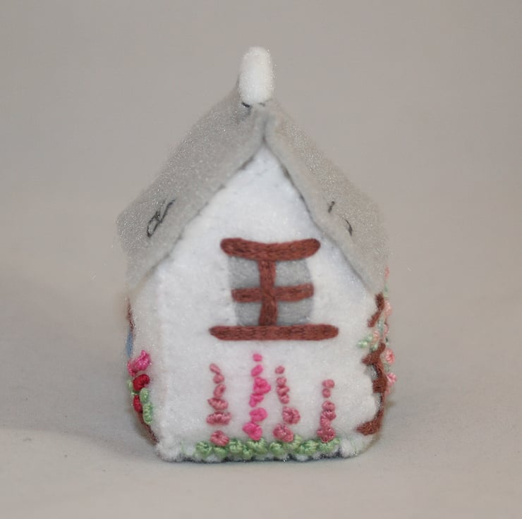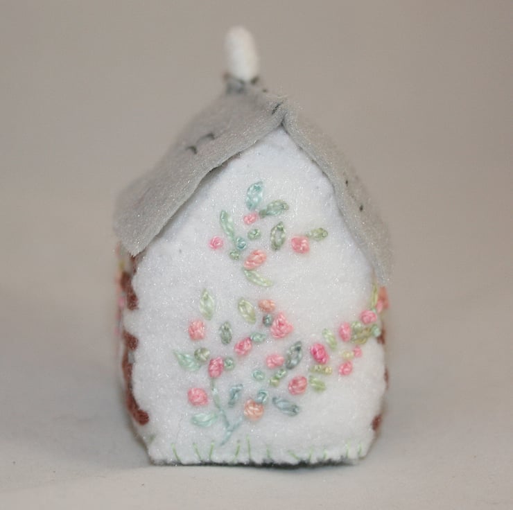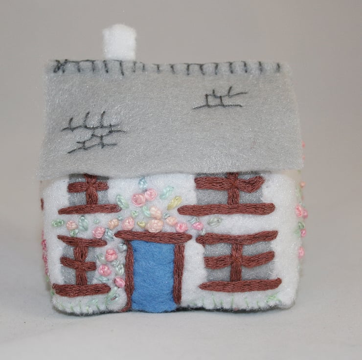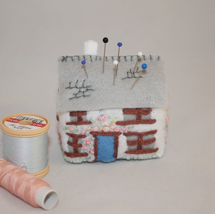 Pretty pink and cream roses twist round the front door of this little felt cottage and climb happily up one gable end. A lovely pin cushion to add to your collection or a welcome gift for a sewing friend.