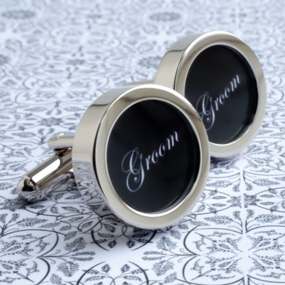 Cufflinks for the Groom with Groom written in black script text across a white background. Simple and elegant.