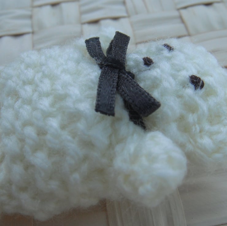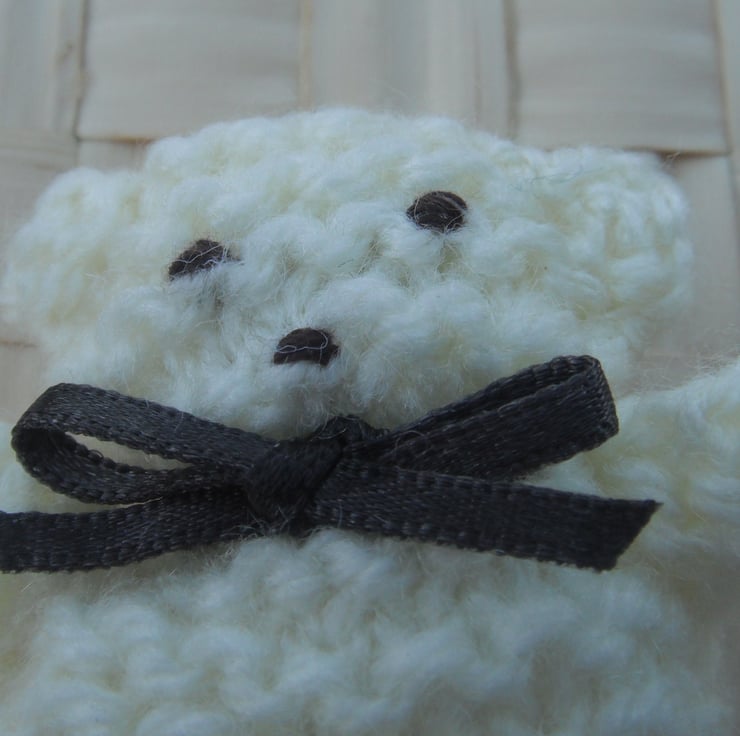 This cute little bear is hand knitted in cream wool, with a hand stitched face and finished off with a bow.