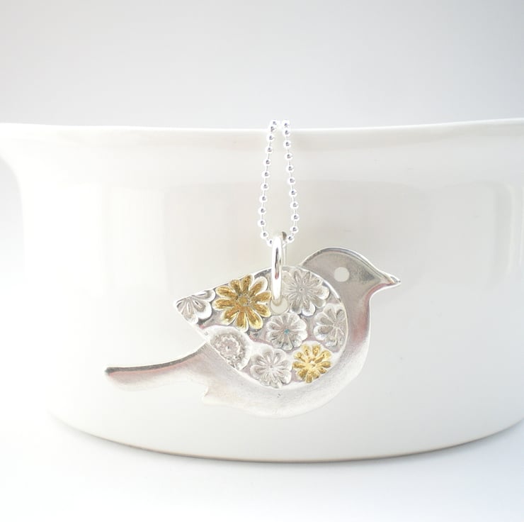 I hand crafted this bird pendant from fine silver and then gave her a beautiful little floral textured silver and gold wing.