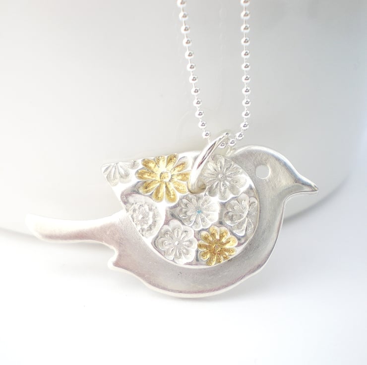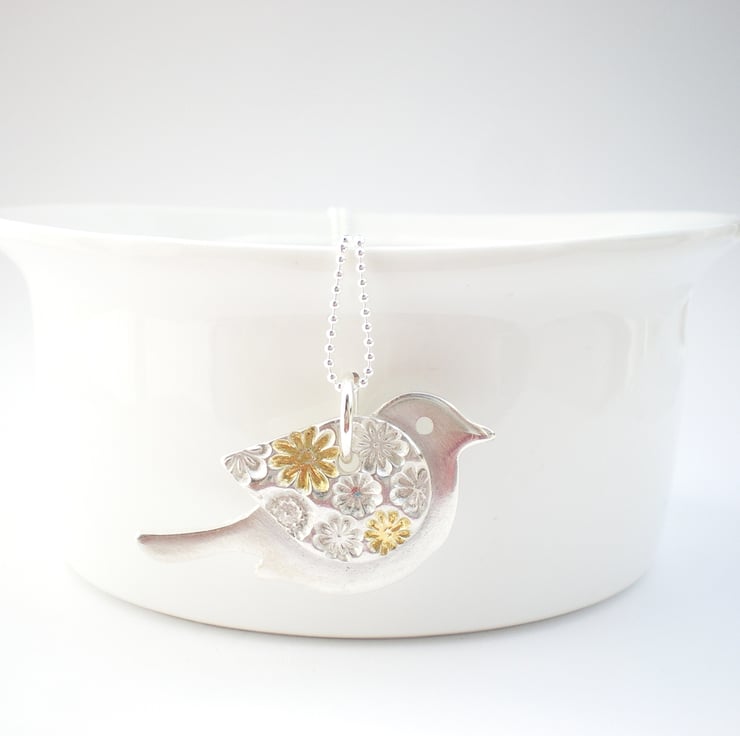 Bigger than my other tiny birds, she measures 3.5cm (1 1/2 inches) from beak to tail and 2cm across his tummy. Her wing has a floral texture which has 24ct gold fused to some of the flowers and then the remaining silver surface has been polished to a soft shine. The texture really stands out beautifully!