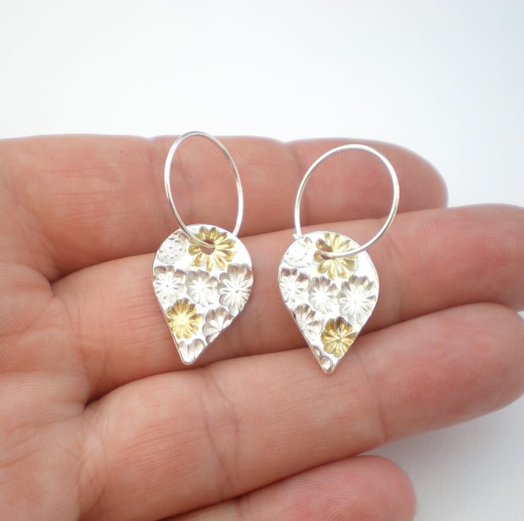 Fine silver and gold floral textured dangle style earrings. Inspired by nature, made from reclaimed silver and gold they make a great eco friendly choice!