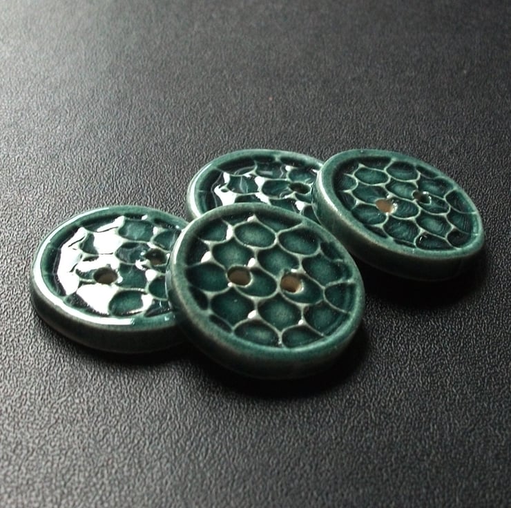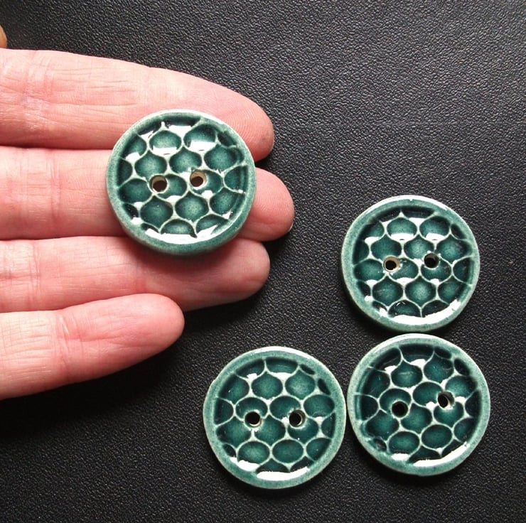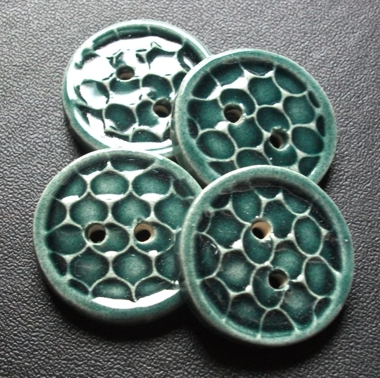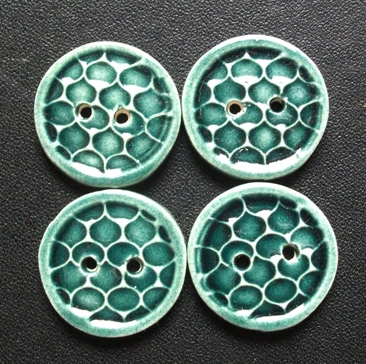 This set of four buttons are made from white earthenware clay, embossed and glazed to 1100 degrees, so nice and strong.