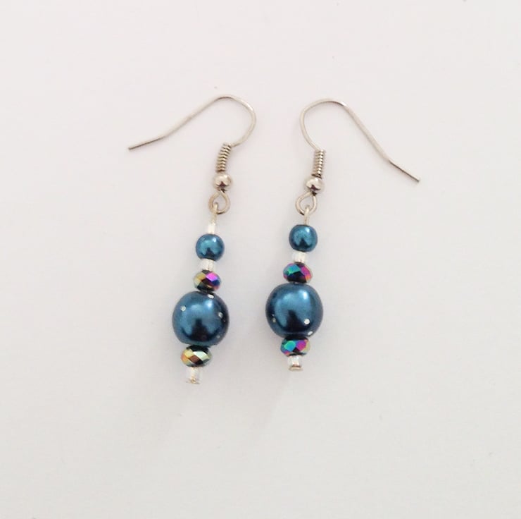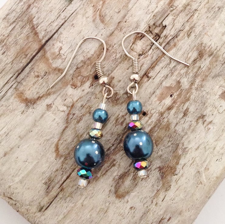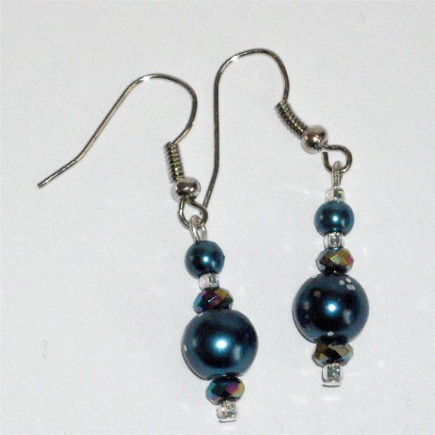 These lovely earrings are made from midnight blue pearl beads with silver stardust effect (silver glitter on large pearl beads) and crystal beads on silver plated earring loops.