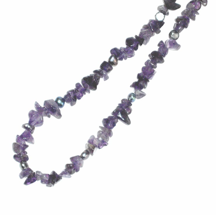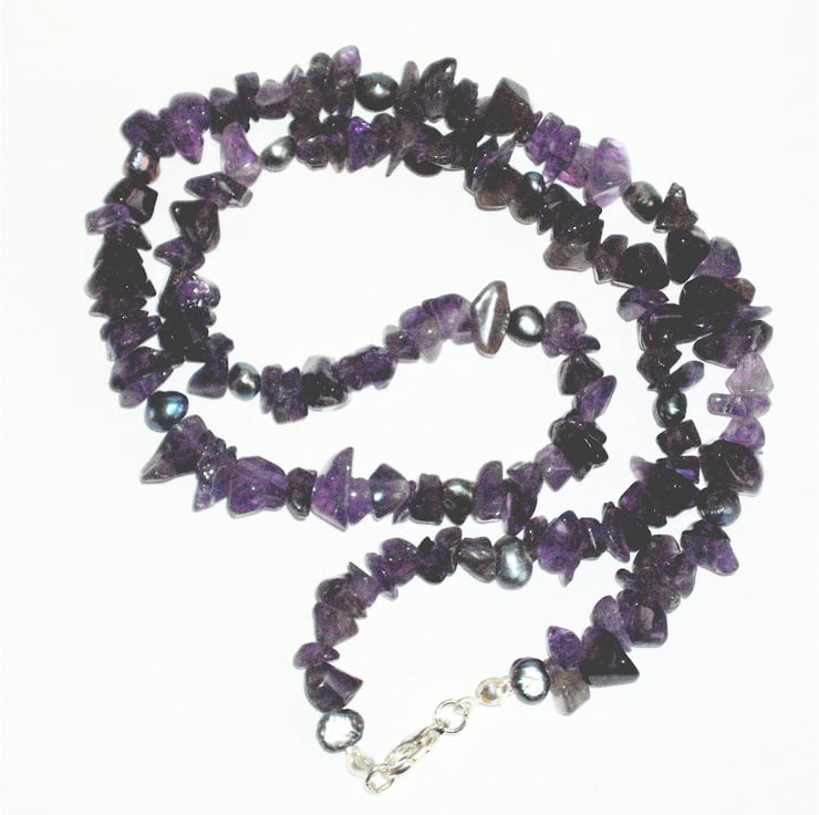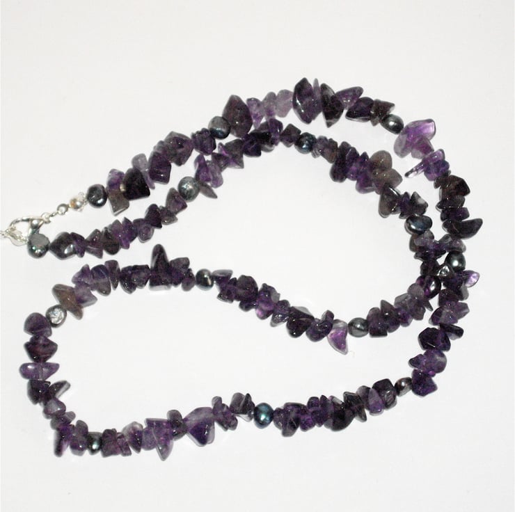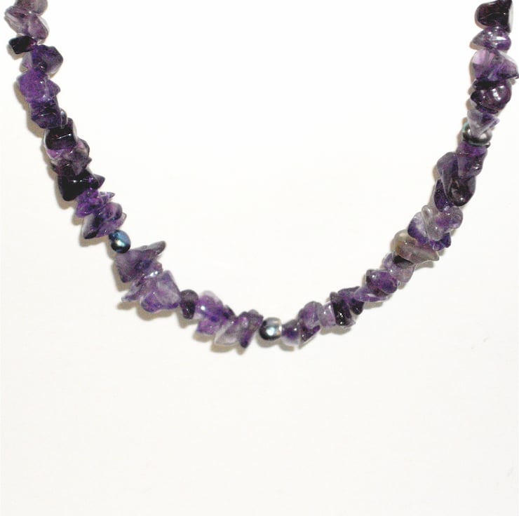 This beautiful necklace is made from amethyst chips and freshwater pearls with a silver plated catch.