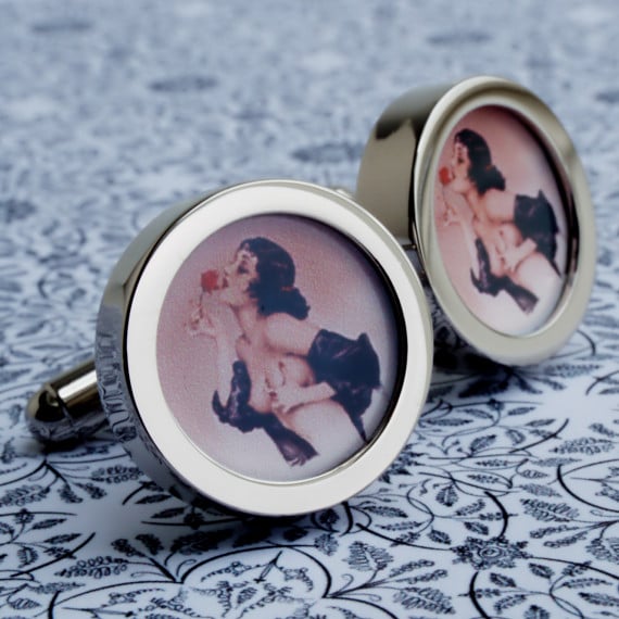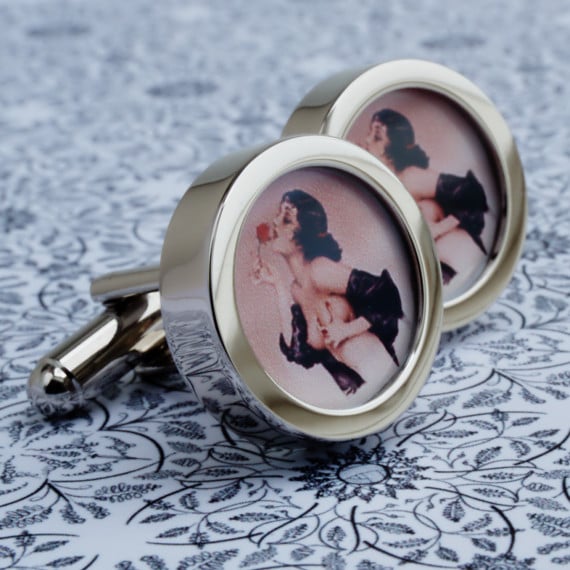1920s flapper girl, raven haired nude with a red rose cuff links held between her fingers. These cuff links depict a beautifully illustrated image, created in the 1950s. Romantic and nostalgic.