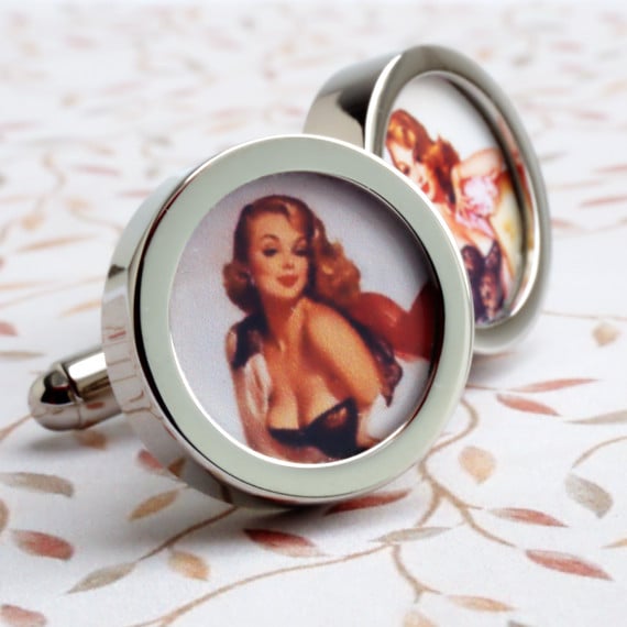 This pair of sexy cufflinks shows two seductive 1950s pin up girls with long flowing locks dressed only in their lingerie. These sexy vintage cuff links of a unique design are guaranteed to get a smile!