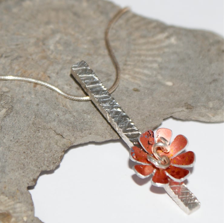 Lovely textured sterling silver stick pendant with a red hand painted flower in aluminium joined with a silver wire stamen. This pendant is hand made by me and is hung from a 16 inch sterling silver snake chain. Flowers can be made in other colours, please message me with your requirements. Please note your pendant may vary very slightly as I make each one to order.