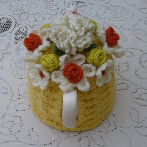 The cosy has been handmade using good quality yarn in a lovely yellow colour. The top of the cosy is decorated with a large crochet carnation in cream with four green leaves. There are four individual small mustard coloured roses and four large cream flowers with small orange rose centres. In between the large cream flowers are very pretty little flowers in cream with orange centres.
