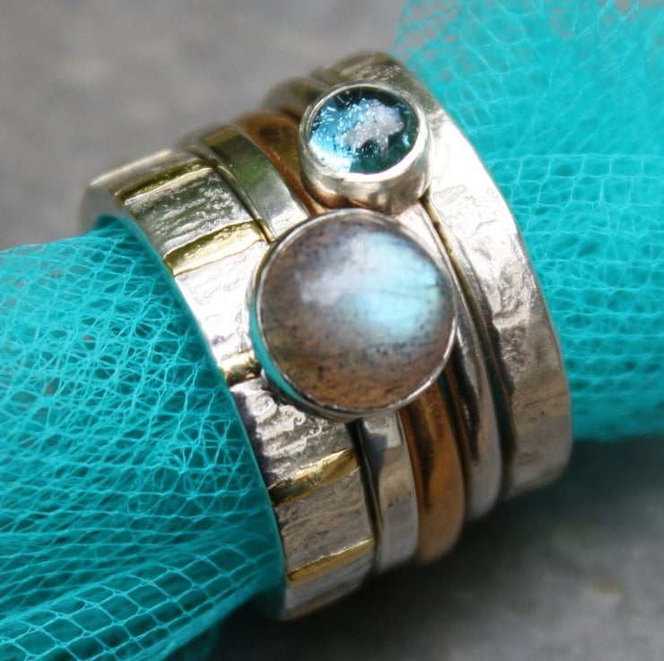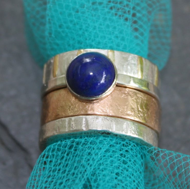 Pictured you can see it stacked with other rings I offer, red gold , inlayed yellow gold etc. But you may already have rings you could team it with.