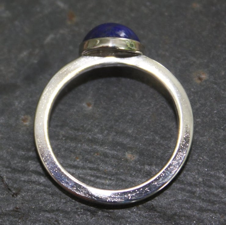 A large 8mm cabochon llapis has been set onto a 2mm square silver band. The height of the band allows the stone to sit comfortably over many rings, looks equally good with mixed metals, or plain silver.