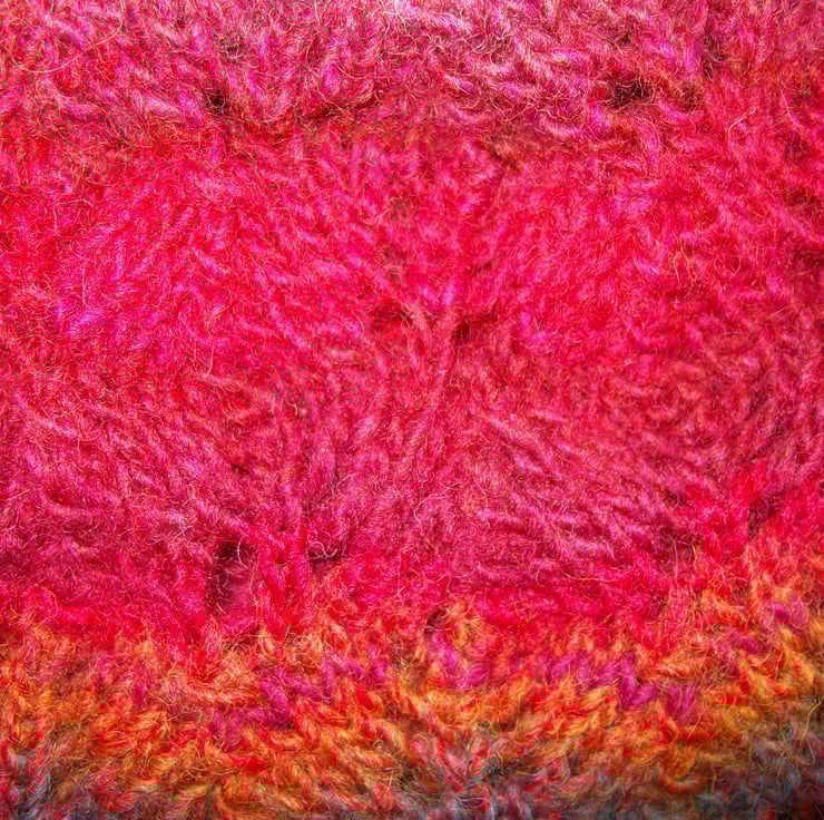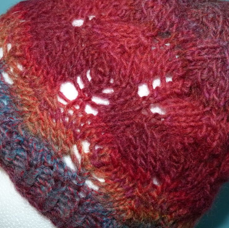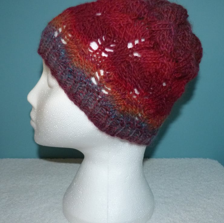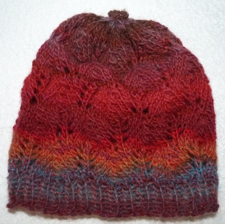 I have hand knit this lovely hat in an aran weight yarn which is 53% wool and 47% acrylic. It is a really soft yarn, in beautiful autumnal shades, knitted with a leafy lace design.