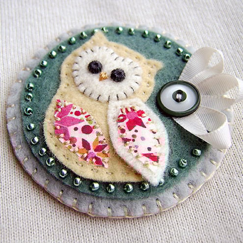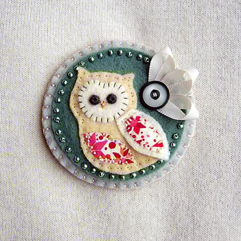 This is a lovely handmade fabric brooch. It features a little owl with an appliqued wing and belly. It is mounted onto a circular felt base and edged with pretty beads. It is finished with a button and ribbon detail and has a brooch backing for easy attachment.