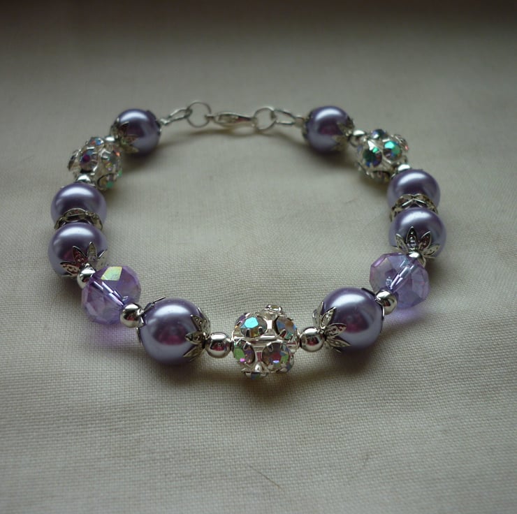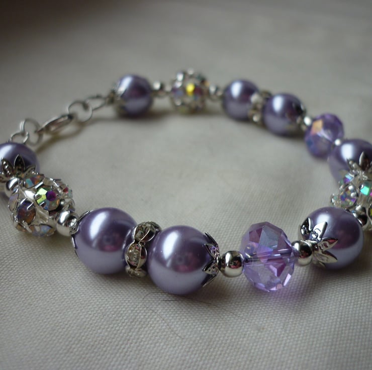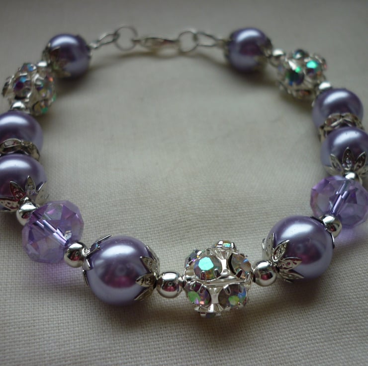 THE BRACELET HAS BEEN MADE WITH 10MM GLASS PEARLS IN LAVENDER ALONG WITH GLASS FACETED RONDELLE BEADS IN LAVENDER, SILVER COLOURED FANCY BEAD CAPS, SILVER COLOURED SPACER BEADS, SILVER COLOURED RHINESTONE RONDELLES AND FINISHED WITH A SILVER PLATED LOBSTER CLASP AND FINDINGS.