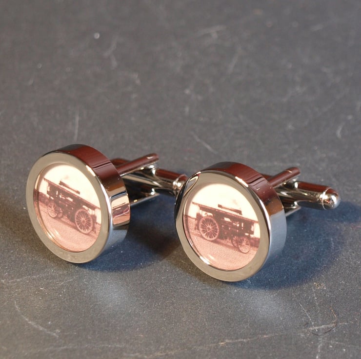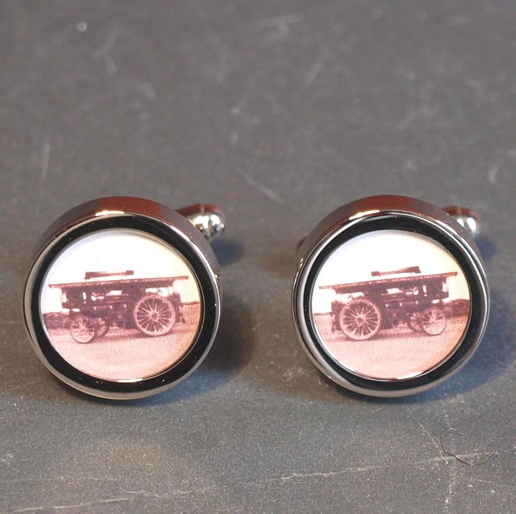 Cuff links of an old Irish steam wagon from an antique sepia toned photograph. Great vintage transport cuff links for any fan of steam engines and locomotives.