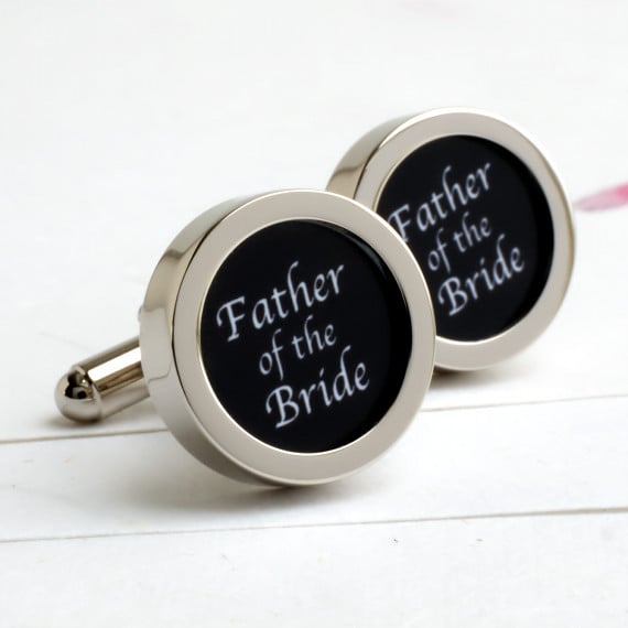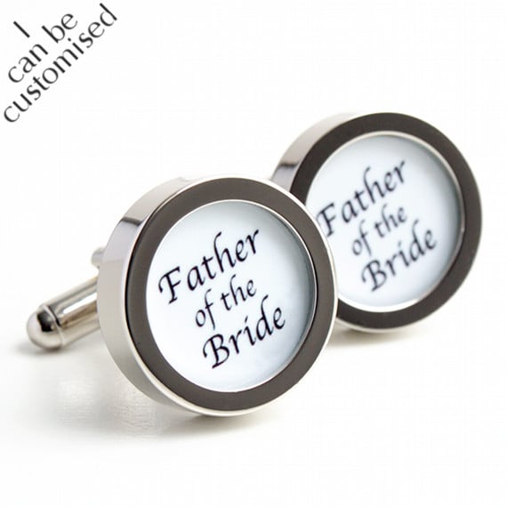 Wedding cufflinks for the Father of the Bride written in classic black letters on a white background. See my shop for more cufflinks for your wedding in this style and others. These are also available with a black background and can also be made in your choice of colour.