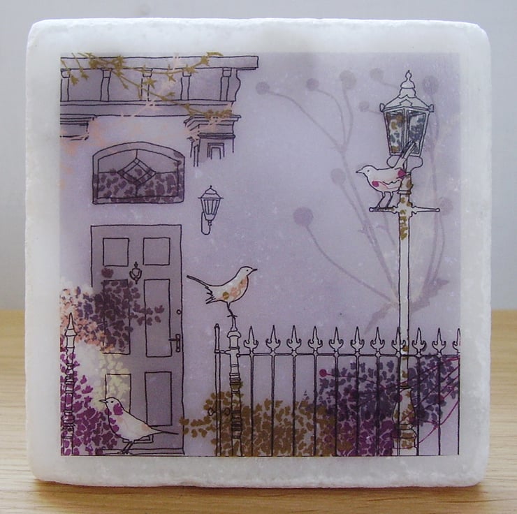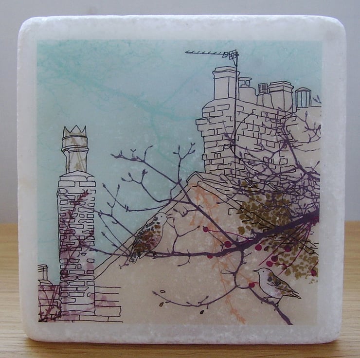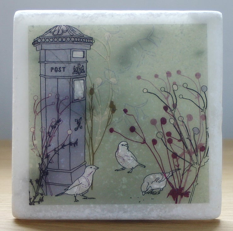 Each tile features my original artwork, this range of design is inspired by the birds you are most likely to see about town. The design is created through a combination of hand drawn imagery, drawing directly on the computer screen and taking patterns and shapes from my own digital photographs. These elements are then layered and positioned until i am happy with them to make the finished design you can see on the product. My design is then printed onto a special decal paper which is carefully applied to a white marble tile. Each tile is varnished so can be safely wiped clean without harming the design. Each tile also has foam feet making them scratch resistant and a 'littlebirdy' sticker on the back.
