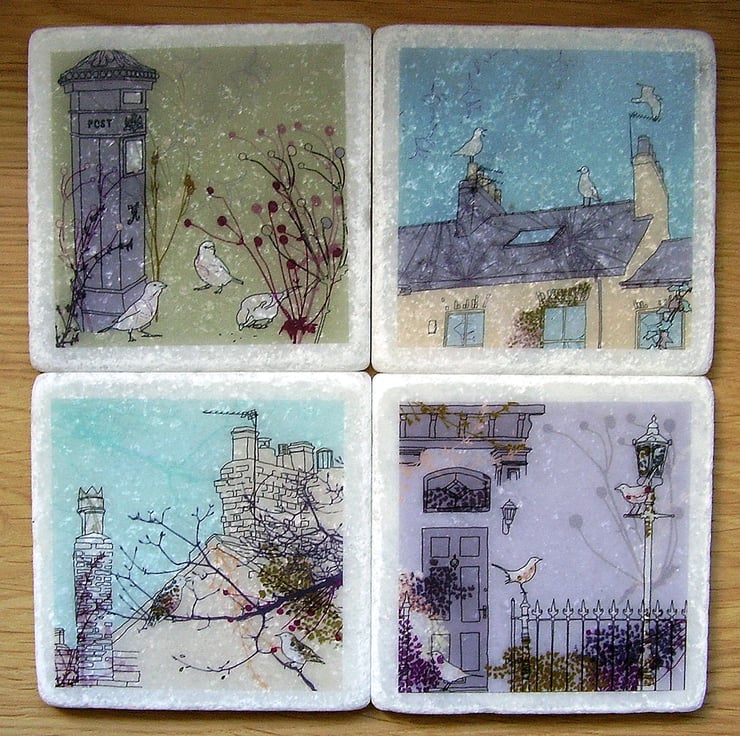 A set of four white marble coasters each decorated with an original littlebirdy design.