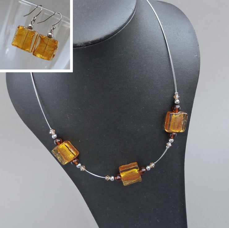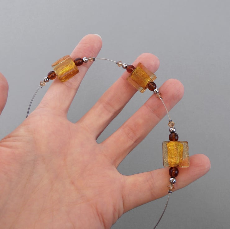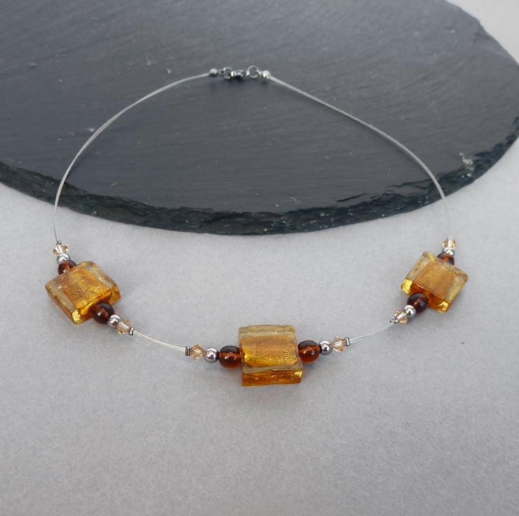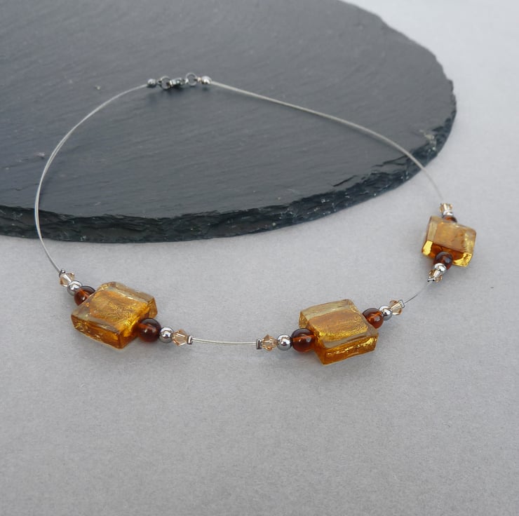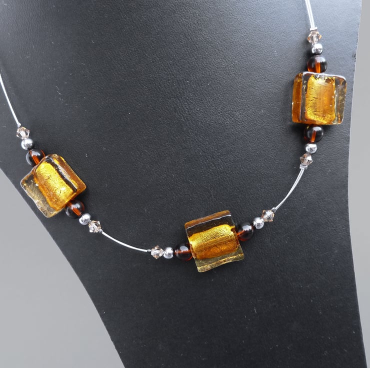 Each golden, 1.5cm square bead used to make this amber fused glass necklace is formed by trapping fine layers of foil within coloured glass. The foil gives the beads a metallic shimmer. I have coupled these with Czech glass beads, sparkling crystals and gunmetal beads. These square glass bead necklaces allow you to add a pop of colour to your outfit without breaking the bank.