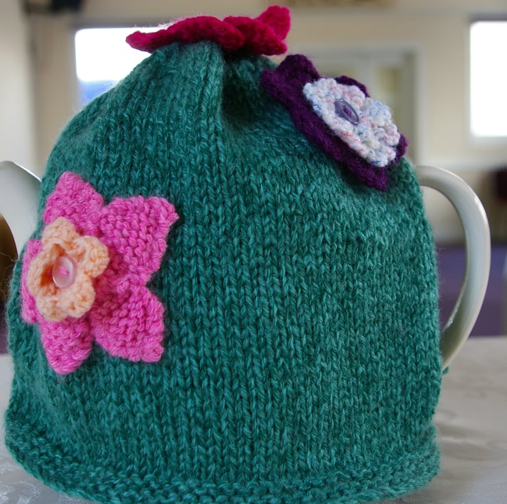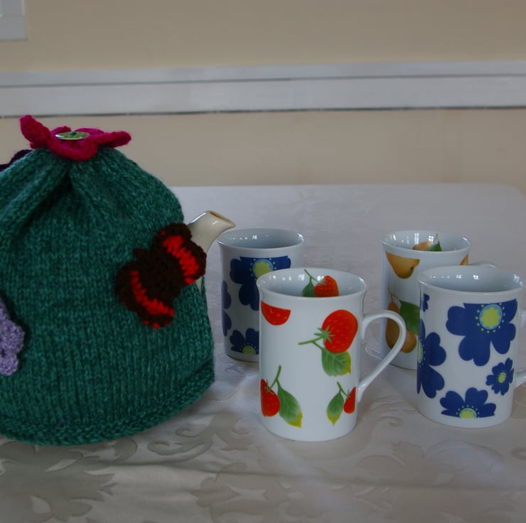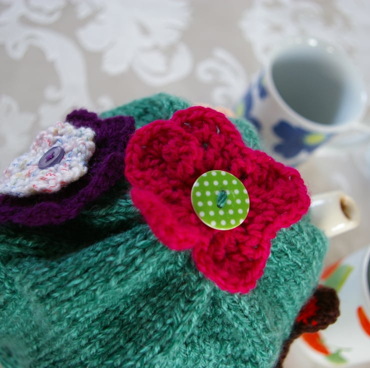 Keep your favourite pot of Tea nice and hot with this thick warm Aran weight yarn in a two tone, green fleck Teapot Cosy. The cosy has been decorated with crochet and knitted flowers and a stylized Red Admiral crochet Butterfly. It will fit a six cup Teapot.