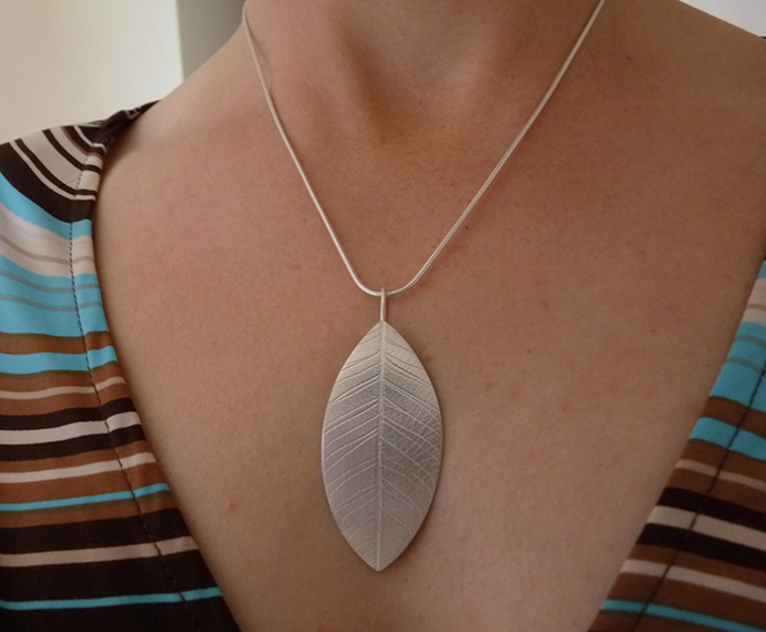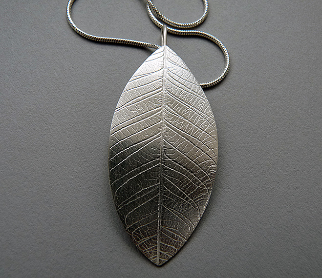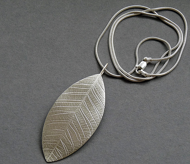 This contemporary leaf pendant has been entirely hand fabricated in sterling silver. The leaf has been given an organic texture by rolling a skeleton leaf into silver then cutting around the imprint.