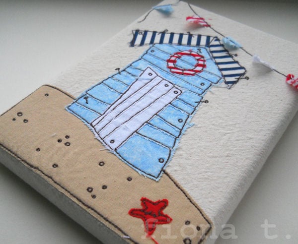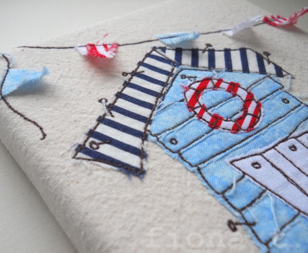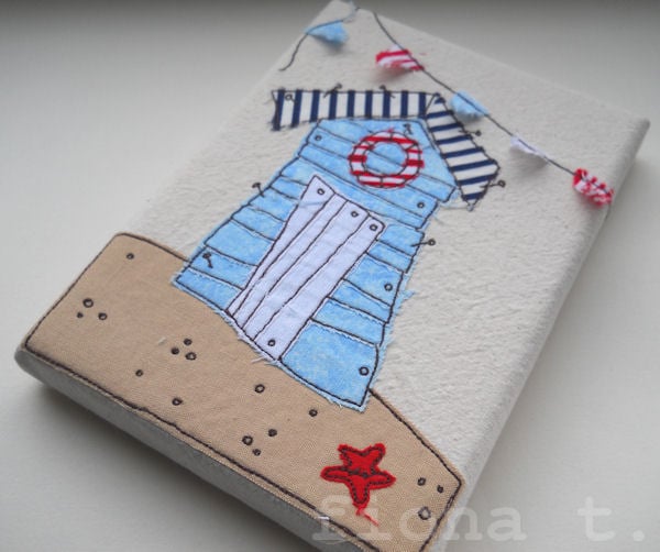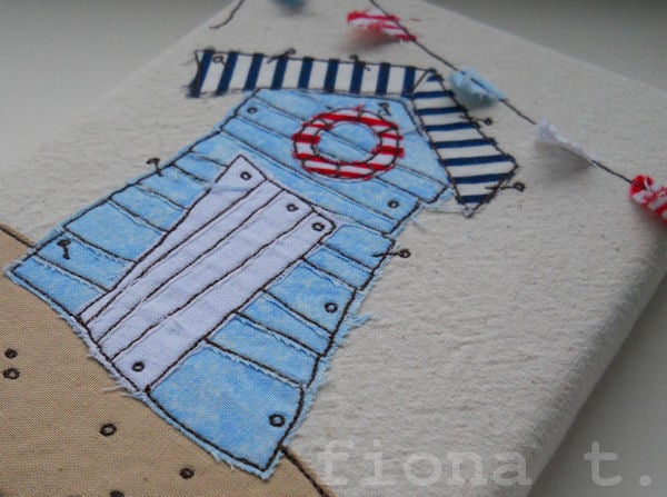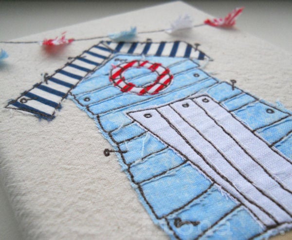 the hut is made from layered strips of pale blue cotton, and its sturdy door is constructed similarly from white cotton. they are held together by free motion embroidered nails.