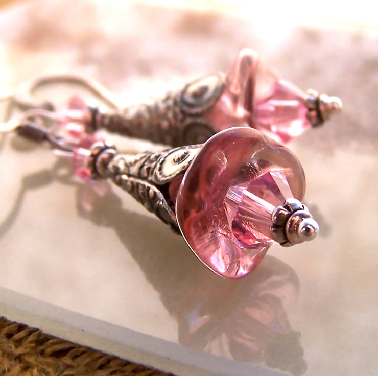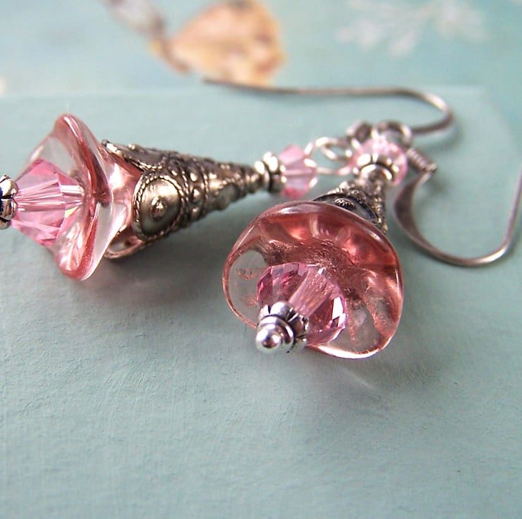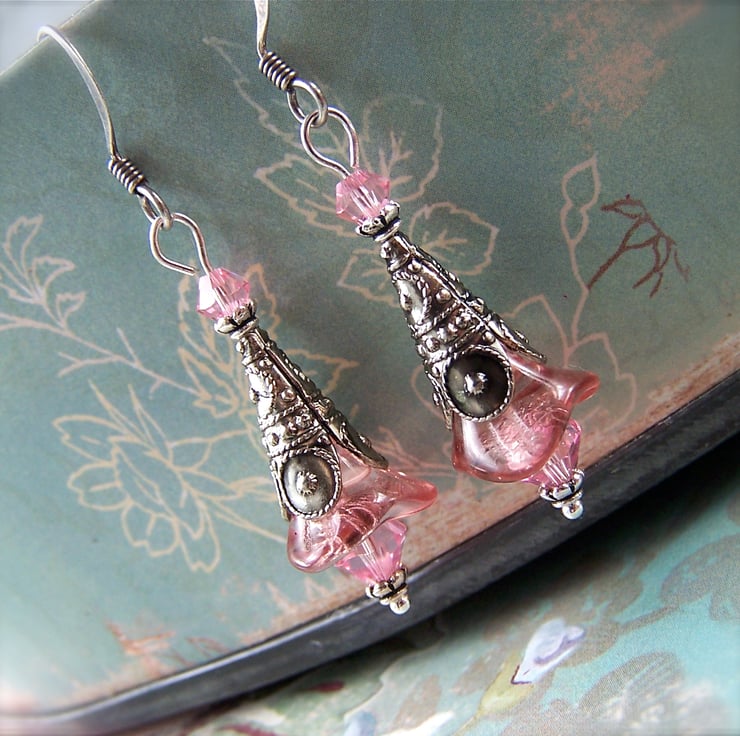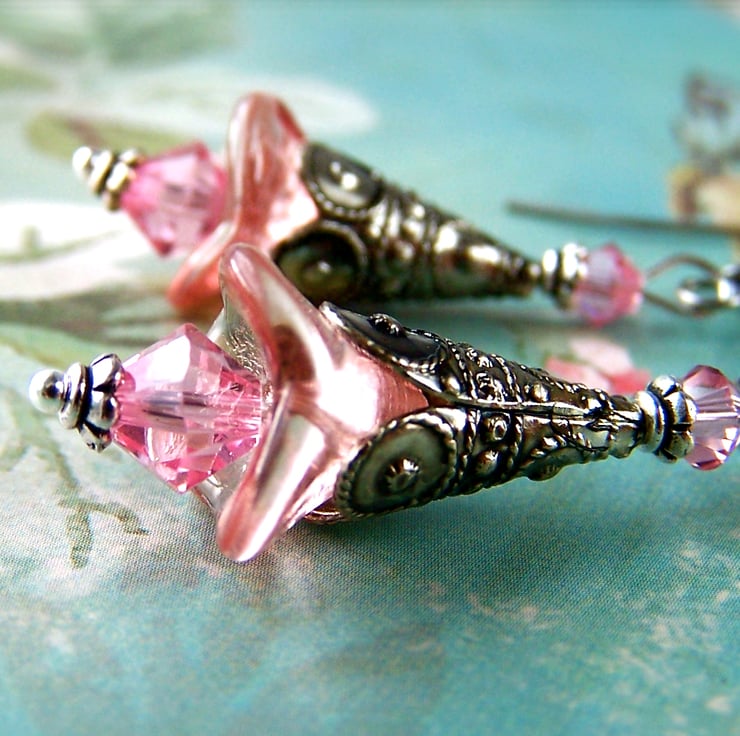 These pink flower earrings with their fancy silver cones have more than a touch of olde worlde Edwardian glamour and sophistication - pretty and elegant in a vintage style!