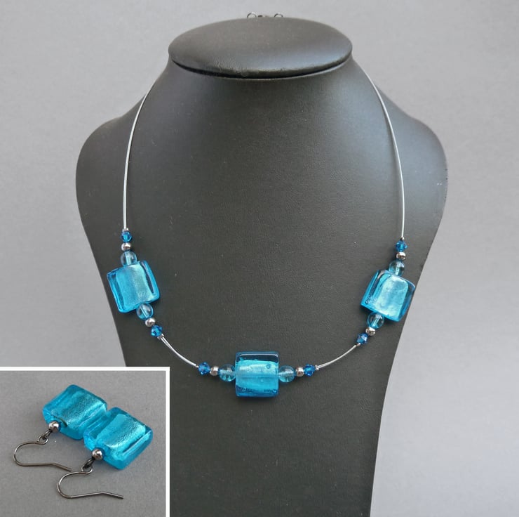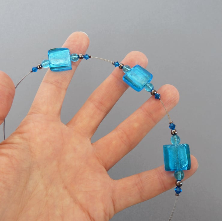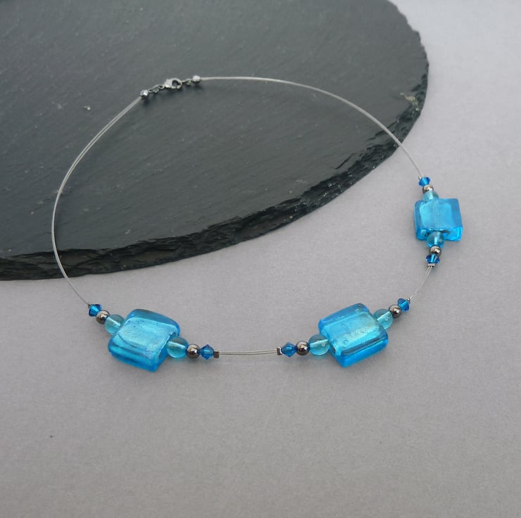 The glass focal beads featured in this turquoise, fused glass necklace are created by encasing silver foil between layers of vibrant, sea blue glass. The foil gives the beads a metallic sheen. The focal beads are 1.5cm squares. I have coupled these with Czech glass beads, Swarovski crystals and gunmetal beads. These necklaces are a reasonably priced way of adding a pop of colour to any outfit.