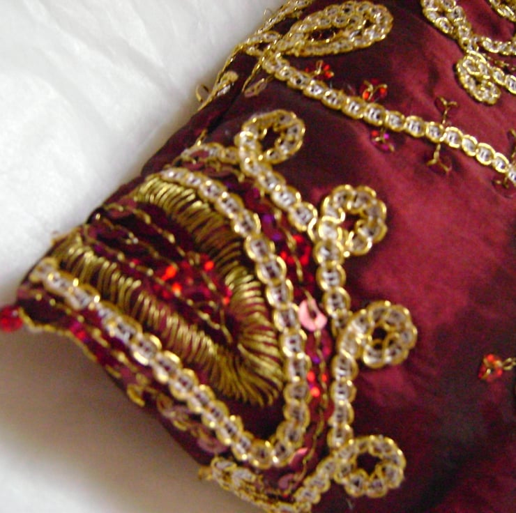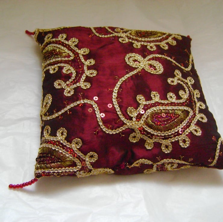Handmade beautiful deep red and gold ring cushion with bead detail on each corner. Ideal if you want to add a glimmer of luxuriant colour to your special day or perhaps to compliment that red / gold themed wedding. Size width / length approx 24cm.