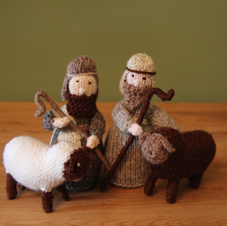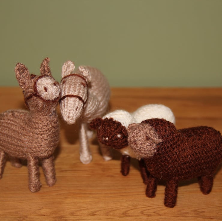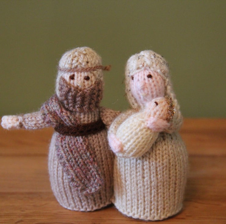 This is a gorgeous Christmas 'Knitivity' with all they key players present - Mary & Joseph, the Baby Jesus and the Donkey, the 3 Kings and their camel, the Shepherds with their flock (well, two of the sheep anyway!) and the Angel Gabriel. I didn't design this, it's knitted from a pattern by the fabulous Alan Dart, but I have adapted it by stitching everything together rather than using glue which may decay over time. The characters are about 11 cm tall with the animals ranging from about 6cm to 10 cm. This will make a lovely window sill decoration for Christmas. Nor suitable as a toy due to the pipe cleaner legs, halos & crooks.