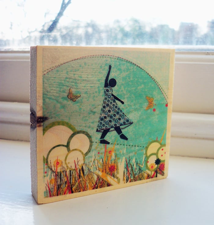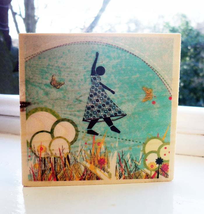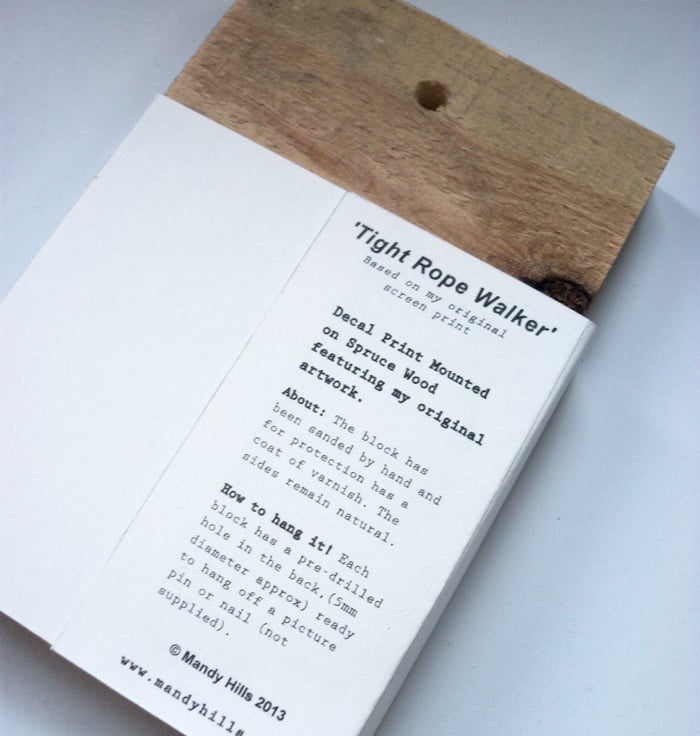 Based on my original screen print I have reproduced the artwork onto decal paper and then carefully placed this onto a hand sanded wooden block - For extra protection the artwork has a coat of varnish - The sides remain natural. Each block has a pre-drilled hole in the back (5mm diameter approx) ready to hang off a picture pin or nail on your wall.. also sits rather well on a windowsill!